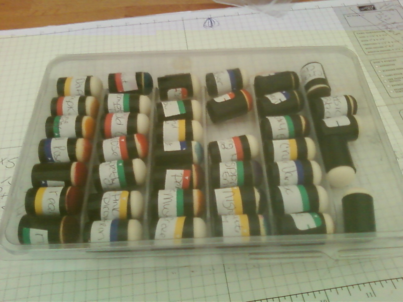 Last week I thought I would find a new way to organize my daubers and this is what I came up. This container is the one the alphabet sets used to come in. But, any container will work they fit in. So far I have one per color. I plan on having 2 for each color to speed things up at hostess club. I just used these little labels and just hand wrote them on. Next week tip I will show you how I organized my reinkers.